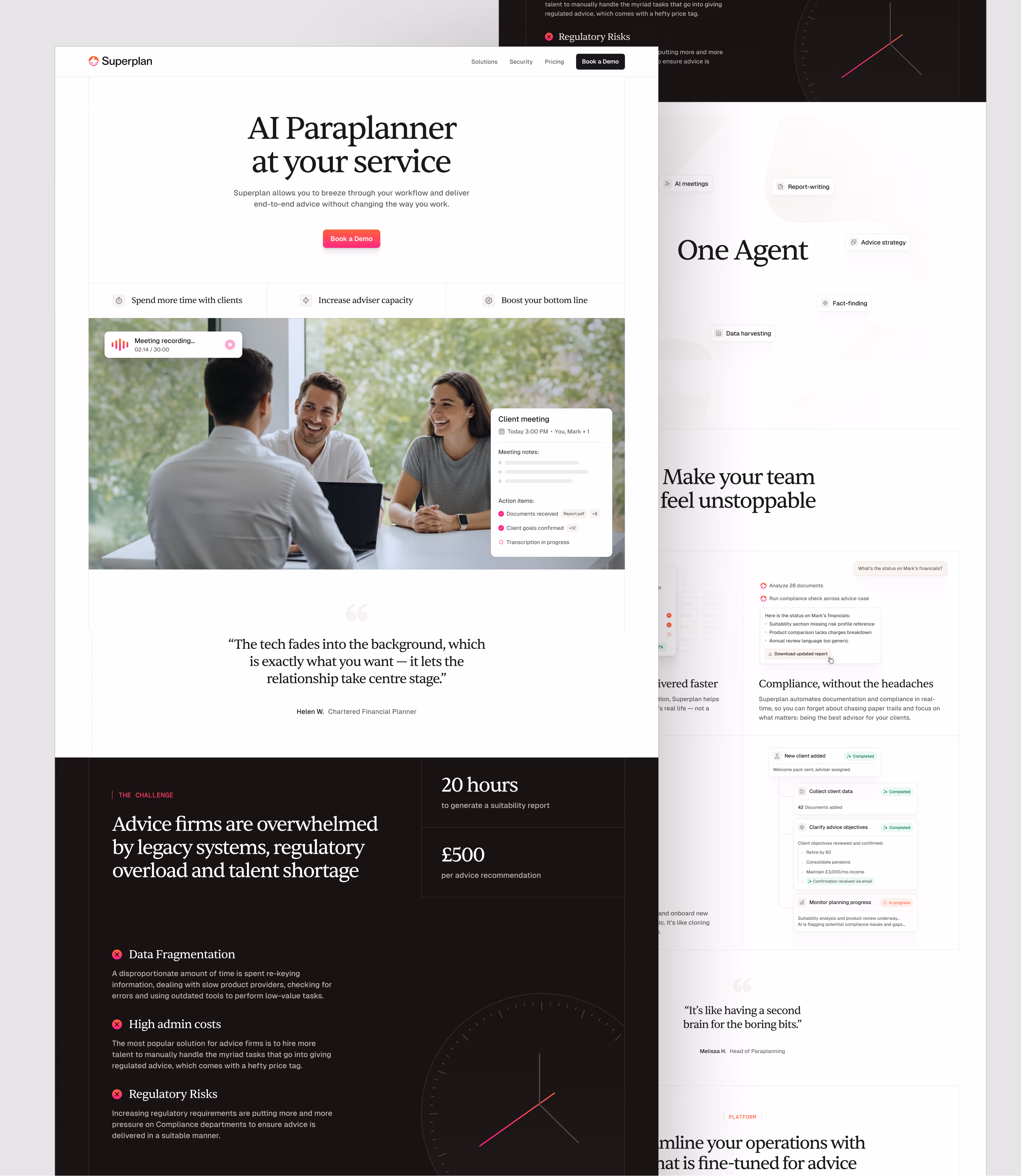 Superplan is an AI paraplanner that helps deliver end-to-end advice. We collaborated with the team to completely revamp their web presence with a new modern look, sleek animations and beautiful illustrations. The result is a website that drives interest, investment and separates Superplan from compeition.